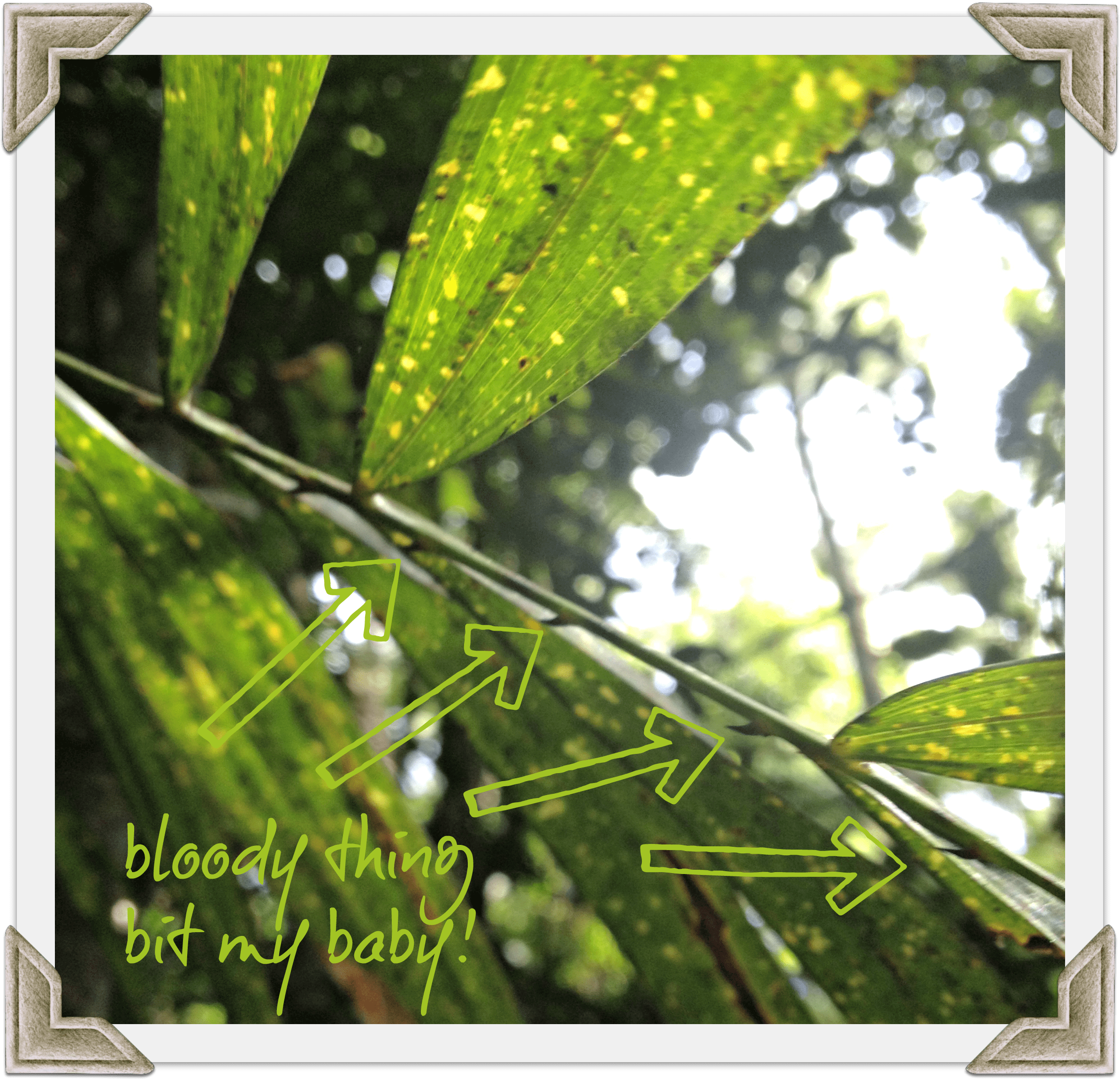 Our little family embarked on a short rainforest walk after breakfast, before beginning the trek home via Cairns. I fell behind, unable to take photos and keep up with the blistering pace Bearhands was setting. This is how I managed to capture the exact moment Bearhands dragged the Little Sister’s bean under the spiny underside of a palm.