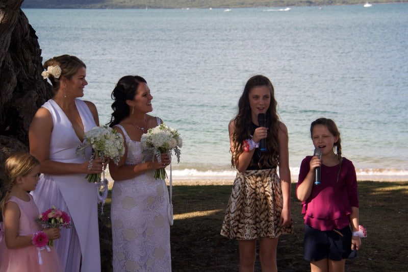 Stunning brides! I got goosebumps. This post makes me so happy to see marriage equality happening in NZ! What a beautiful location. The little flower girls were adorable too (wink)