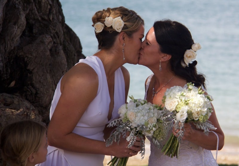 Then something amazing happened: just as the brides exchanged their vows, a giant rainbow appeared in the bay behind them. Tears of happiness (from me, not them!)