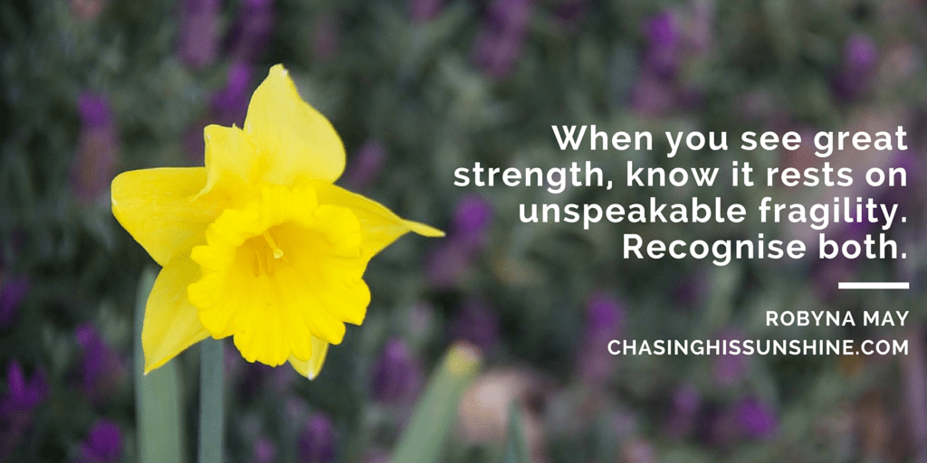 Robyna’s words resound with me because she’s eloquently expressed something that I’ve been feeling. Even though we seem to be going about our daily lives, it doesn’t mean that we’re feeling better or getting over it. We’re functioning, but it’s no measure of the depth of our love, or our loss, or our pain. Some days it’s all we can do to remember to breathe. Robyna now write a blog called Chasing His Sunshine. It’s a service to bereaved families everywhere.