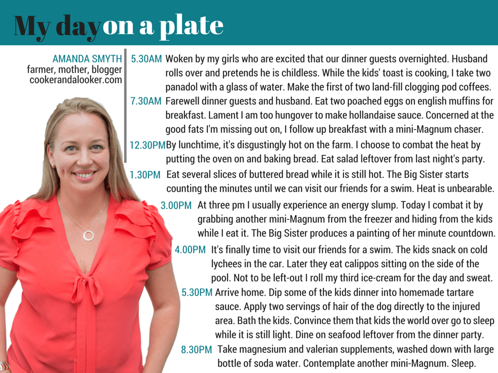 No doubt you’ve seen the “My day on a plate” feature in the Sunday lift-out of the Sydney Morning Herald. Here’s my Saturday on a plate and I promise there’s not an activated almond in sight!