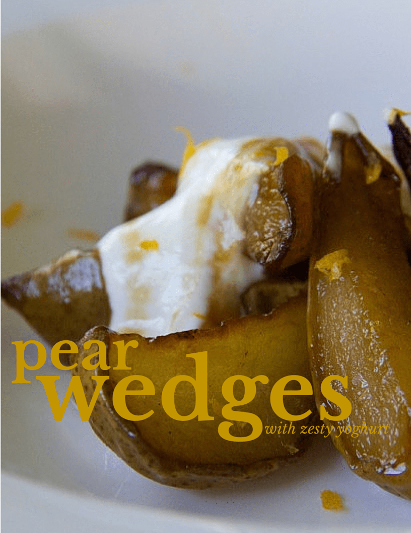 To serve, arrange the pear wedges on a plate add a dollop of yoghurt and sprinkle with orange zest. Simple huh?