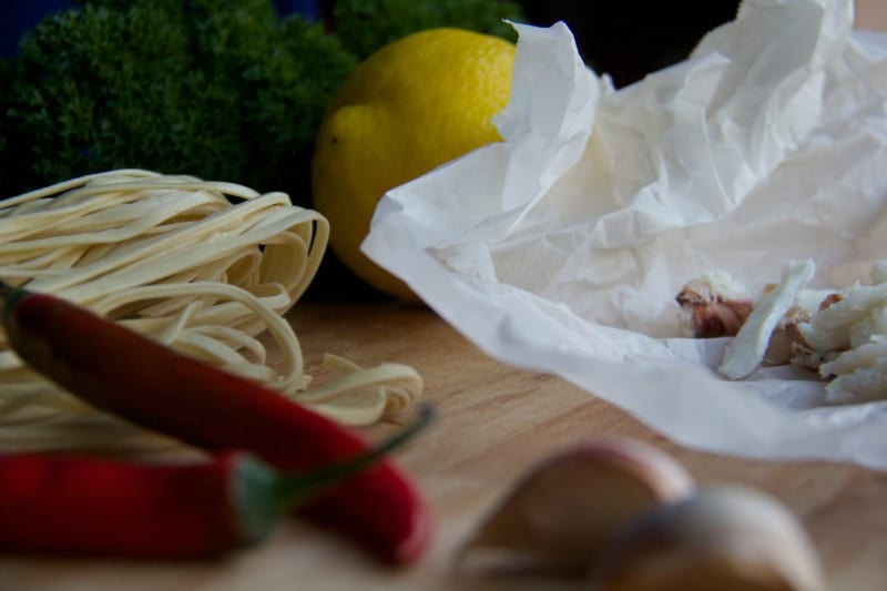 Finely chop the garlic and parsley. Deseed and finely dice the chillies. Zest the lemon. In a large frypan, heat the olive oil over a low flame. Add the garlic, lemon zest and chillies and sauté gently. Remove from heat and set aside.