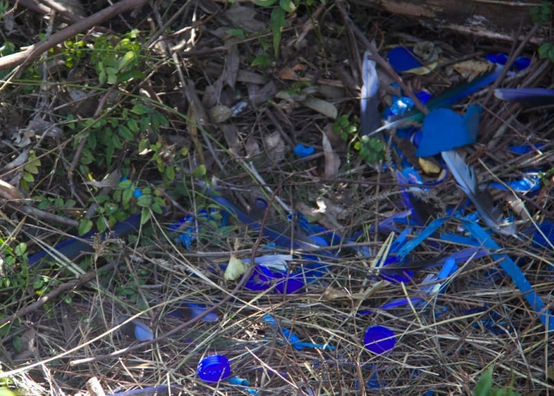 Bowerbirds construct and decorate dance platforms, then use their moves to impress the laydeez. The colour of love is blue if you’re a female bowerbird, so the fellows collect cerulean tokens of their affection and scatter them around their pad. The theory is the better the collection, the better the mate. The bloke who built this platform is an overachiever.