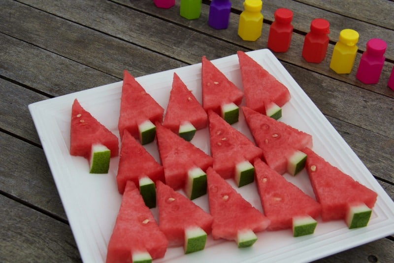 I’ve never seen watermelon disappear from a party table so quickly! These little watermelon Christmas trees look fiddly, but they take no time at all. Kids love stuff with a handle!