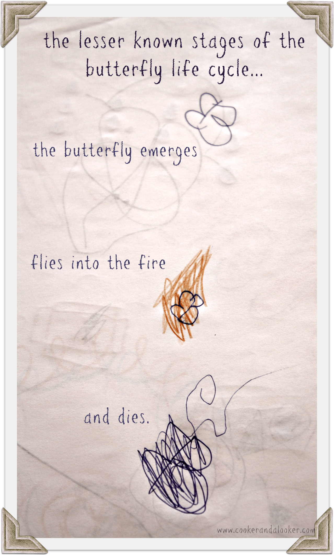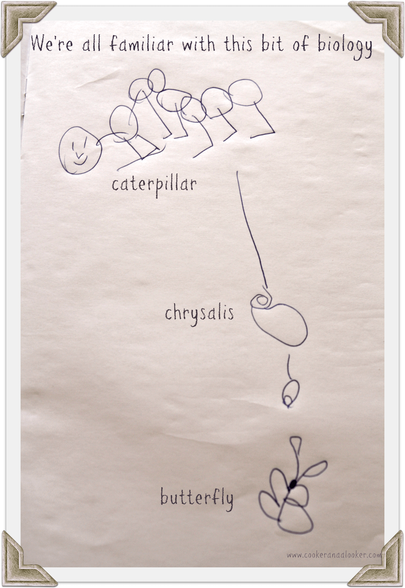 See that little bit of science that I seamlessly squeezed into conversation there? That’s the product of three and a half years of university, and it seems I’m not the only zoologist in the family. This week during the incessant crafting the Big Sister produced this diagram of the lesser known life stages of the butterfly.