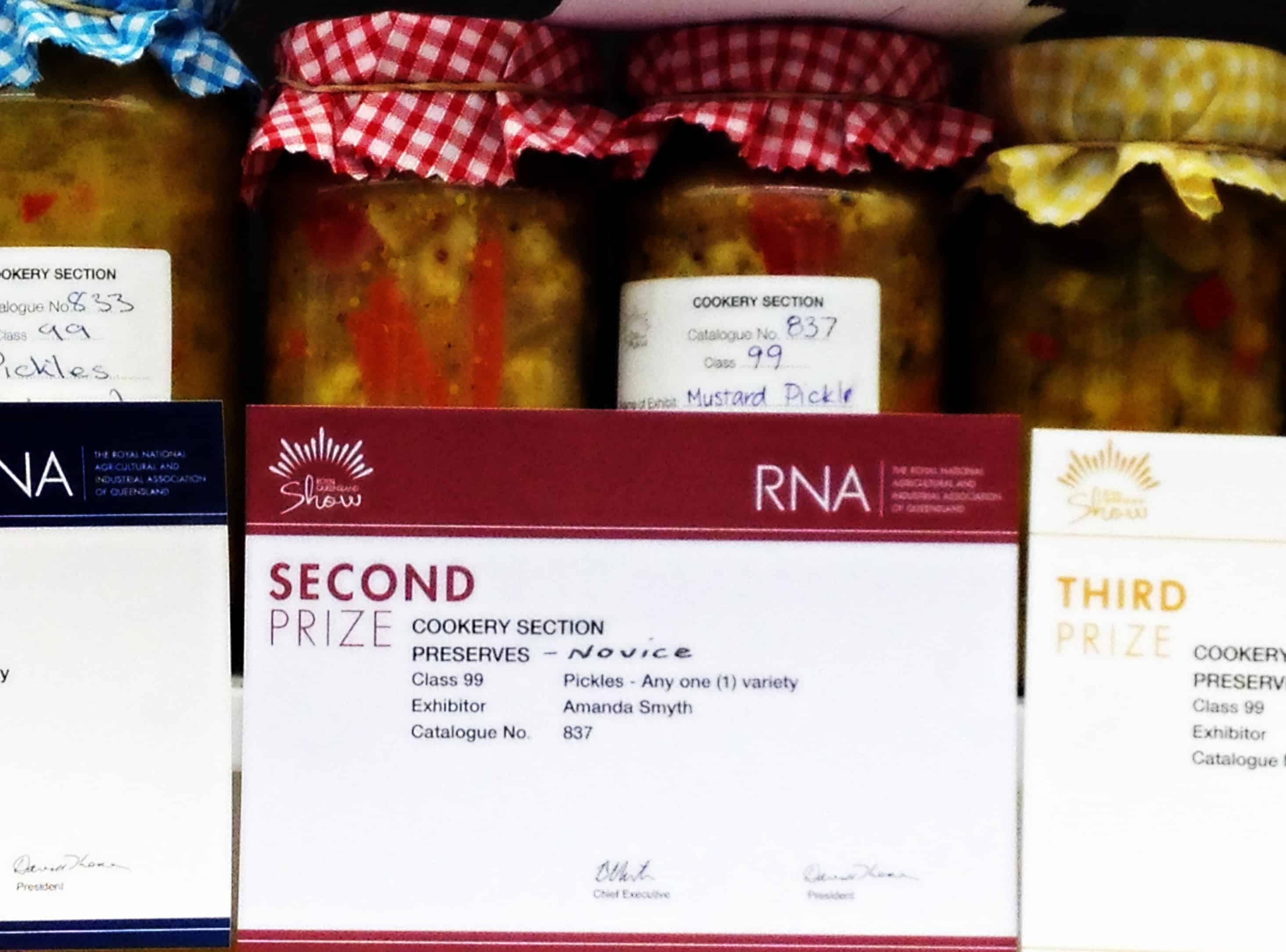 Specifically, I came second in Class 99 – Pickles (any one variety), Preserves – Novice. (This class is only open to persons whom have not previously one a blue ribbon at the Ekka). The prize is $12 and the title of being the second best novice pickle maker in the state, which is of course priceless. Fear not people, I won’t let fame change me.