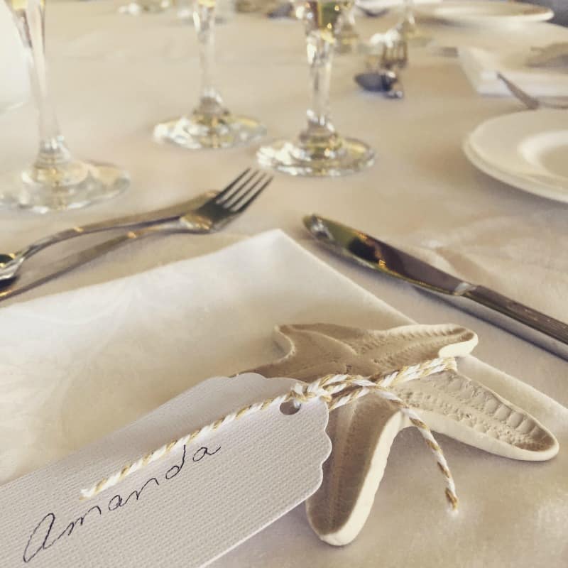 The reception was held at Hughes of Cheltenham and the creative genius behind Loz Loz Designs made these starfish place settings for the reception.