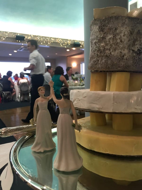 The girls cut their wedding cake made of cheese. Their cake was adorned with the best cake topper in the ever – two brides high-fiving each other.