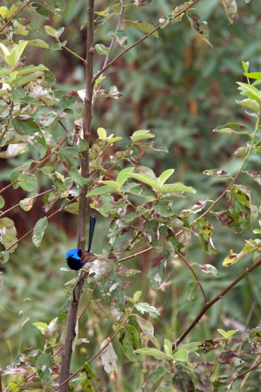 If I’d been faster I’d have missed this superb fairy wren. He was putting on an avian version of Thunder Downunder for an appreciative female. He didn’t make as much noise as the guinea fowls, but he did just as much fluffing and preening. It was working, I could see the “Let’s pretend we don’t have children” look in her eye.