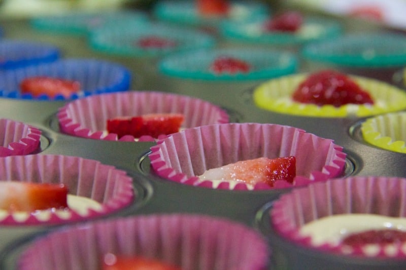 Add cupcake liners to muffin tins. Fill each liner with a spoonful of cake mixture. Then add a piece of strawberry to each cupcake.