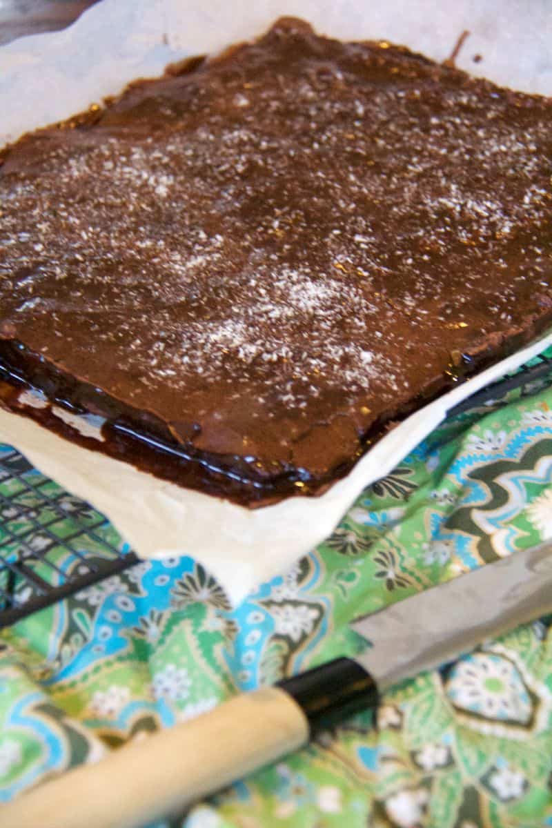 When cooked, allow to cool until just warm. Then ice before dividing into squares.