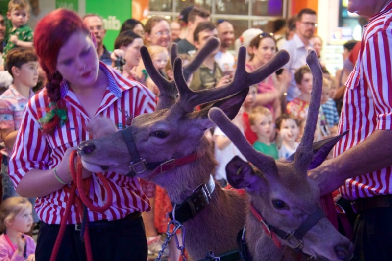 The performers just kept coming. More carollers, strong men doing one-handed hand stands on others’ heads, a Christmas train and finally, Santa and two of his reindeer.
