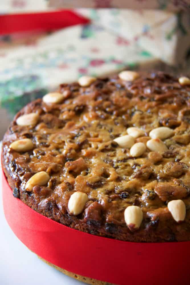 This is truly the world’s simplest Christmas cake. I first heard of this method of making Christmas cake from Kim McCosker’s mum, who told me it’s a recipe from her neighbour. I’ve adapted it slightly, because 1) booze and 2) almonds.